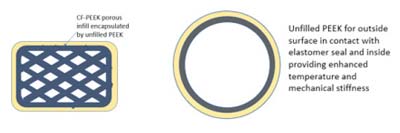 Flipping the application around, an application operating in a harsh high-pressure environment could be encapsulated by a thin layer of unfilled PAEK polymer, while reinforced composites in the interior of the part resist compression or collapse.