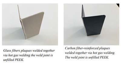 Welding thermoplastic composites can be challenging for several reasons. As Branson reports in their technical guide, filler content over 35% can often be problematic, which most continuously reinforced composites would be. Energy directors of lower filler content could be added to the part through a hybrid printing process. In other contrary cases, Branson reports that fillers can help with weldability. In to a more optimal formulation for the welding process, separately from the rest of the parts to be assembled.