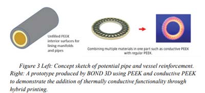 There are many other applications for hybrid multi-material printing. For example, the burst pressure of pipes and vessels are influenced by the strength of the material. In two pipes with the same wall thickness, the pipe made from the stronger material will have the highest burst pressure. However, reinforcement such as glass and carbon sometimes reduce the chemical resistance compared with an unfilled polymer. Hybrid multi-material printing may be used to put unfilled, more chemically resistant polymer in contact with the fluids and chemicals, while reinforced PAEKs provide the strength or temperature resistance built around the fluid channels. Extending the idea, thermally conductive compounds could be combined with a thin layer of unfilled PAEK in heat exchangers. Future applications may include other forms of hybrid functionality, such as adding static dissipation functionality to fluid engineering components, or embedded sensors that use conductive polymer compounds printed into a fluid engineering component.