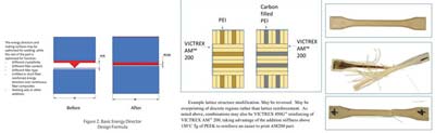 Welding of semi-crystalline thermoplastics can also be difficult due to the high energy required to break down the semicrystalline structure to flow the material. Process conditions may be used in melt extrusion additive manufacturing to locally print amorphous energy directors for welding that may flow much more easily as there would be far less crystalline structure to break down with time and temperature during the welding process. It is easy to conceptualize being able to manufacture parts with amorphous PAEK energy directors and possibly mating surfaces with semi-crystalline or reinforced polymers. During welding, it is possible that the molten energy directors would then crystallize upon cooling.