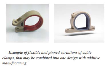 An obvious use for multi-material printing would be combining a flexible material with a reinforced material, either for structural or improved use temperature applications. PAEK is already widely used in aerospace cable clamps such as those shown below. Some of these clamps exploit the flexibility and ductility of unfilled VICTREX 450G by being injection moulded in an open position which can enable 1-handed positioning and fastening in the fuselage at faster assembly rate than is achievable with conventional hinged clamps. On the other hand, some clamps are made with glass or carbon filled compounds, to increase the use temperature or the mechanical properties, which are not flexible enough and then must be assembled with hinges (Figure 2). Hybrid multi-material printing could combine functionality into one part (Figure 1).